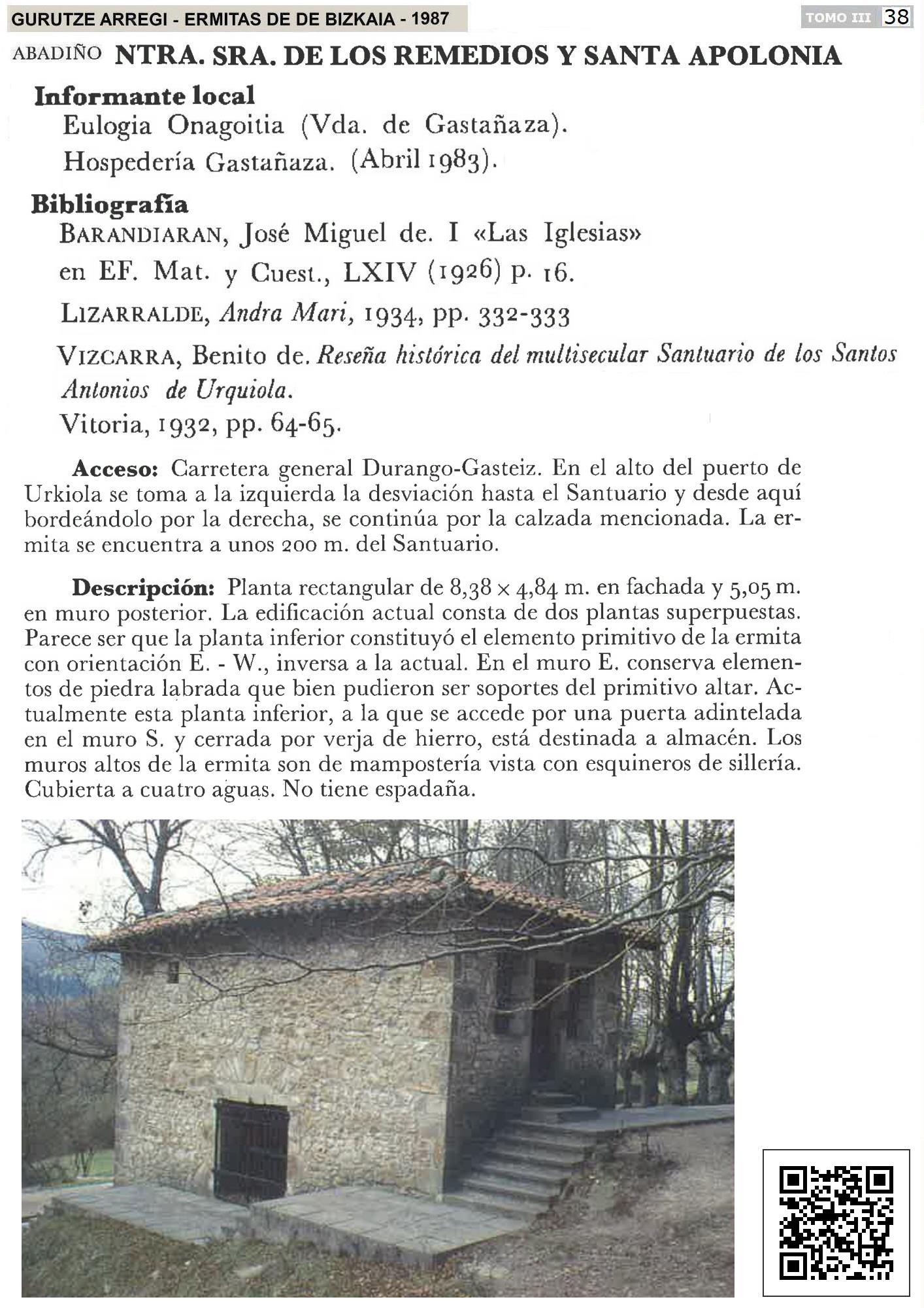 Aislada en la ladera sur de Urkiolagirre, bordeando el Santuario por la derecha, y a unos 200m., en medio de un hayedo, se encuentra la ermita de Santa Apolonia, popularmente denominada “Santutxu”, que se asienta en la antigua calzada de Vitoria. Antiguamente tenía función de humilladero, pues los peregrinos se detenían en ella antes de llegar al Santuario, preparándose para la penitencia o promesa hecha al santo, y muchos caminaban a pie desnudo por la calzada hasta el Santuario. Está edificada sobre una fuente a cuyas aguas se atribuyen virtudes curativas. Al noroeste del Santuario, en la carretera, se encuentra la ermita del Santo Cristo, popularmente conocida como “Kristoren ermita”. Al igual que la anterior, poseía antiguamente carácter de humilladero. https://www.bel.eus/ermita/ntra-sra-de-los-remedios-y-santa-apolonia/ |