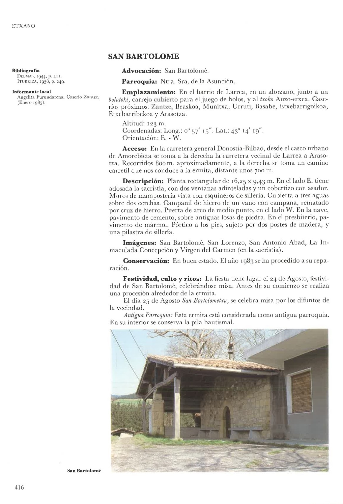 San Bartolomé (Etxano). Se halla en el barrio de Larrea. Es rectangular, con una sacristía adosada, cubierta a tres aguas, con un campanil y cruz de hierro, tiene bancos adosados al muro y pórtico de vigas lo sustentan dos postes de madera y una pilastra de sillería. San Bartolomé es una fiesta propiciatoria del verano, pero también cabe atribuirle un doble significado con una asociación a San Antón Abad el ganadero, pues San Bartolomé fue desollado y es patrono de curtidores, y San Antón Abad, de los lecheros, arrieros y guarda de animales, también cura enfermedades de la piel humanas y animales. |