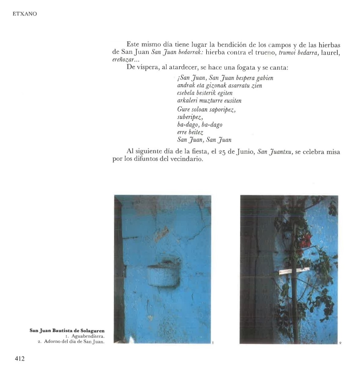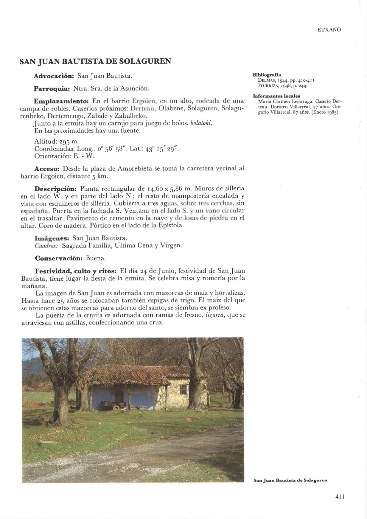 San Juan Bautista de Solaguren (Etxano). Esta ermita está situada en el centro de la cofradía de Ergoien, concentra ritos propiciatorios y exorcistas. La víspera del solsticio se prendía una fogata y se cantaba alrededor de ella. El día del Santo se rogaba al verano que comienza, que proporcionase excelentes cosechas, se hacía unas ofrendas de mazorcas de maíz, espigas de trigo y hortalizas, también se bendecían los campos y hierbas medicinales. El edificio es parcialmente de sillería, completada con mampostería encalada, cubierta de teja a tres aguas y pórtico adosado al lado de la epístola. |
