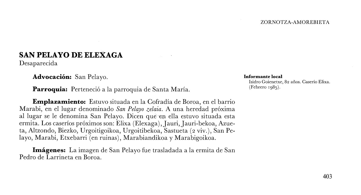 Sin estructuras visibles. Clave E: Área que se especifica en el Plano. http://www.euskadi.eus/app/ondarea/patrimonio-arqueologico/ermita-san-pelayo-de-elexaga/ermita/amorebieta-etxano/fichaconsulta/60061 https://www.euskadi.eus/y22-bopv/es/bopv2/datos/1997/06/9703198a.pdf |