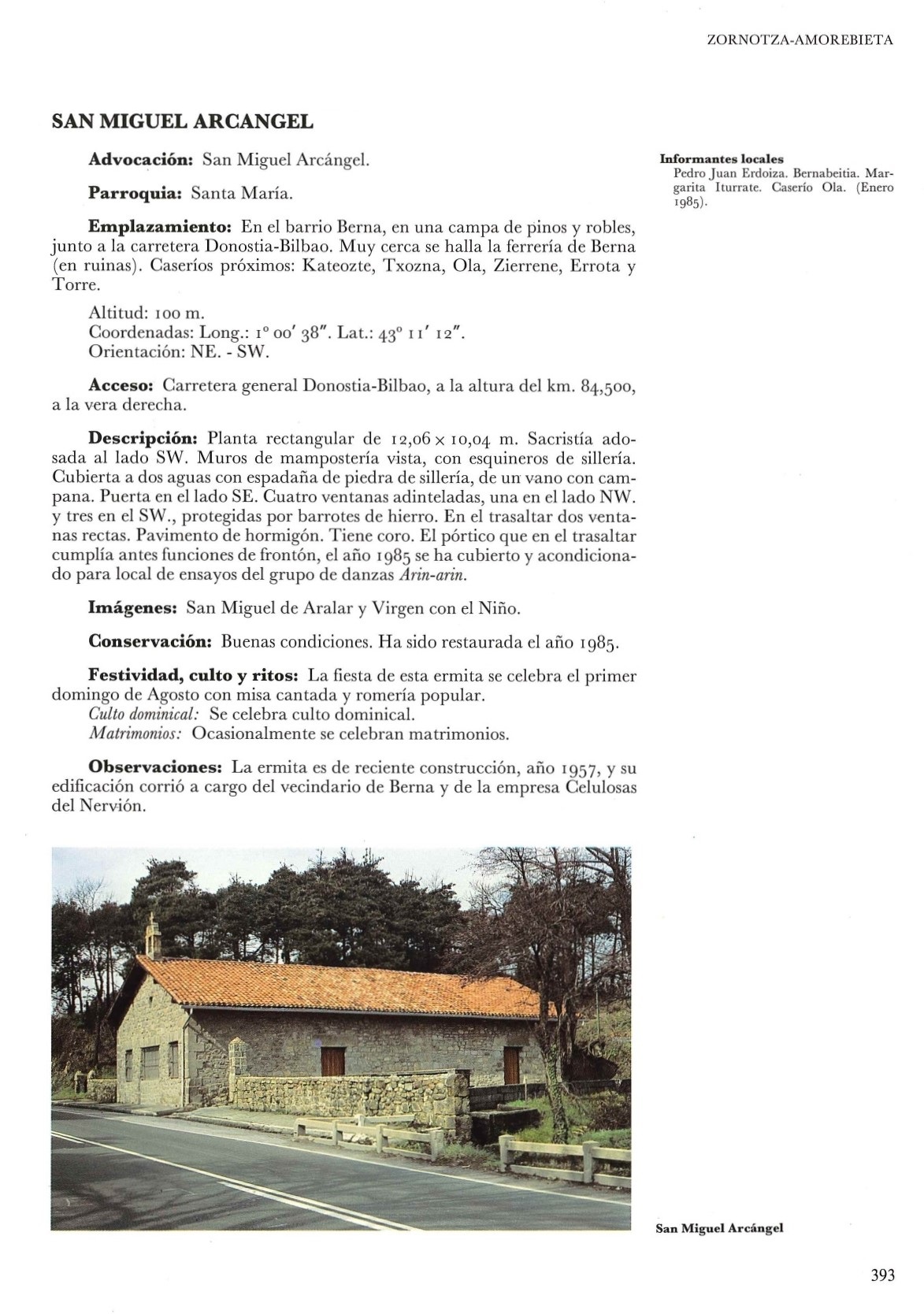 San Miguel de Berna (Amorebieta). Fue erigida en 1957 por el vecindario del Barrio, ayudado por un donativo de una cercana empresa papelera. Se sitúa a escasa distancia de la ferrería de Berna. La advocación se refiere al navarro San Miguel de Aralar. El aparejo se compone de teja a dos aguas con una espadaña con campana. Tuvo frontón, hoy cerrado. |
