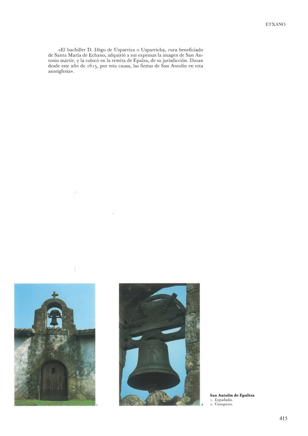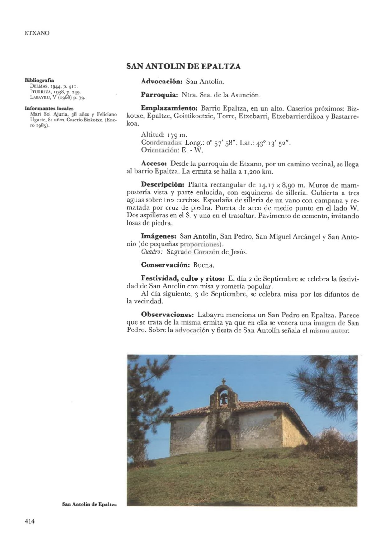 Ermita San Antolín de Epalza Ermita del siglo XVI renovada en el año 1996. Es una ermita de base rectangular y con un tejado construido a tres aguas. Con una pared acampanada de piedra labrada y con una entrada centrada en el pie de un arco dovelado de medio punto. En la pared del sur contiene un reseñable hueco de punta afilada de estilo renacentista. En el interior, tal y como cuenta Gurutzi Arregi Azpeitia en el libro Ermitas de Bizkaia, podemos encontrar una piedra labrada y adornada por flores de forma conopial con una moldura datada alrededor del año 1500. Según las creencias cristianas, San Antolín es el santo protector de las sequías. |
