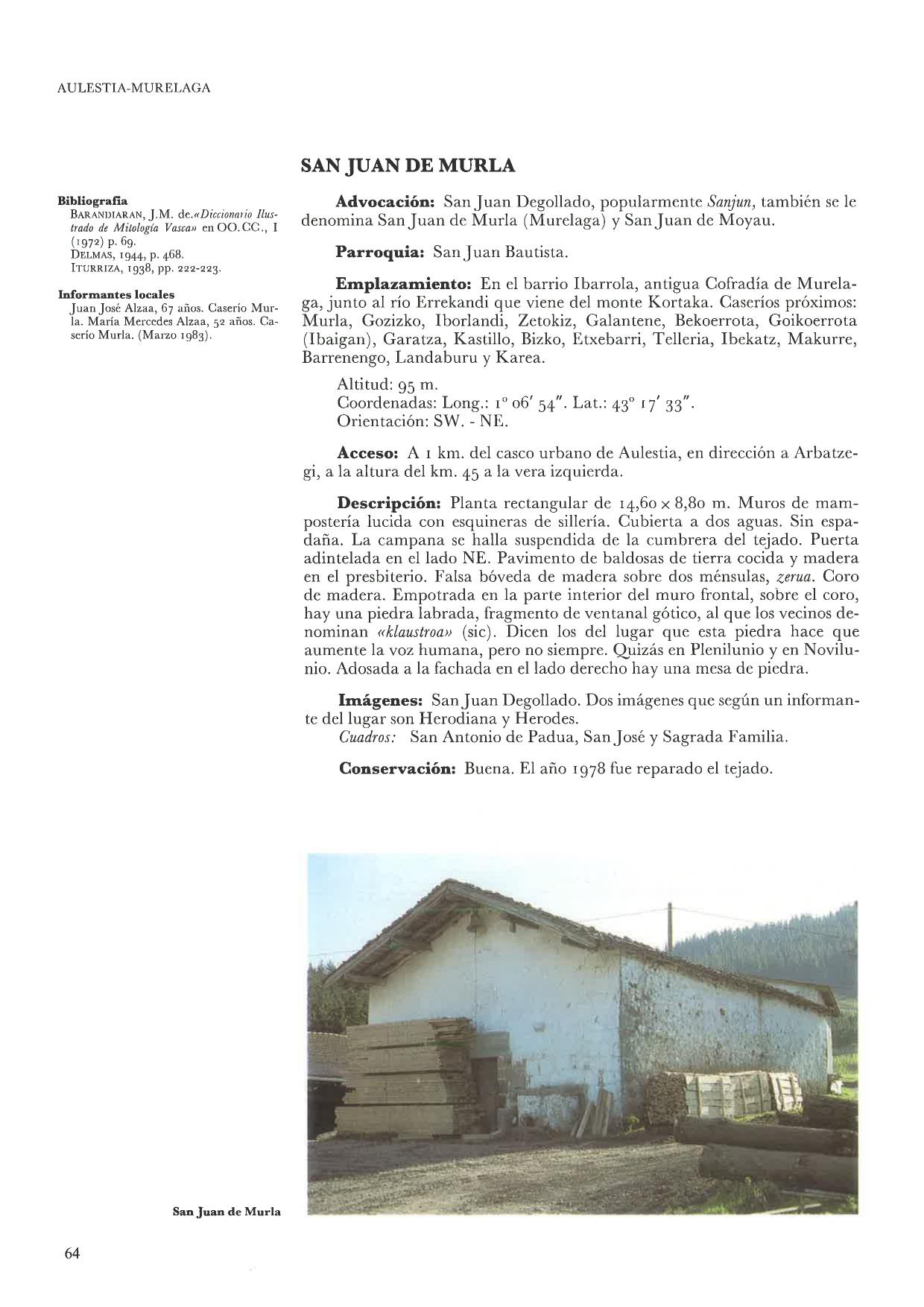 Clave B: Área intramuros del edificio + 15 metros alrededor del mismo, a partir de sus bordes más exteriores. https://www.euskadi.eus/app/ondarea/patrimonio-arqueologico/ermita-de-san-juan-de-murelaga-/ermita/aulesti/-ibarrola/fichaconsulta/61599 https://www.euskadi.eus/y22-bopv/es/bopv2/datos/1997/05/9702820a.pdf |