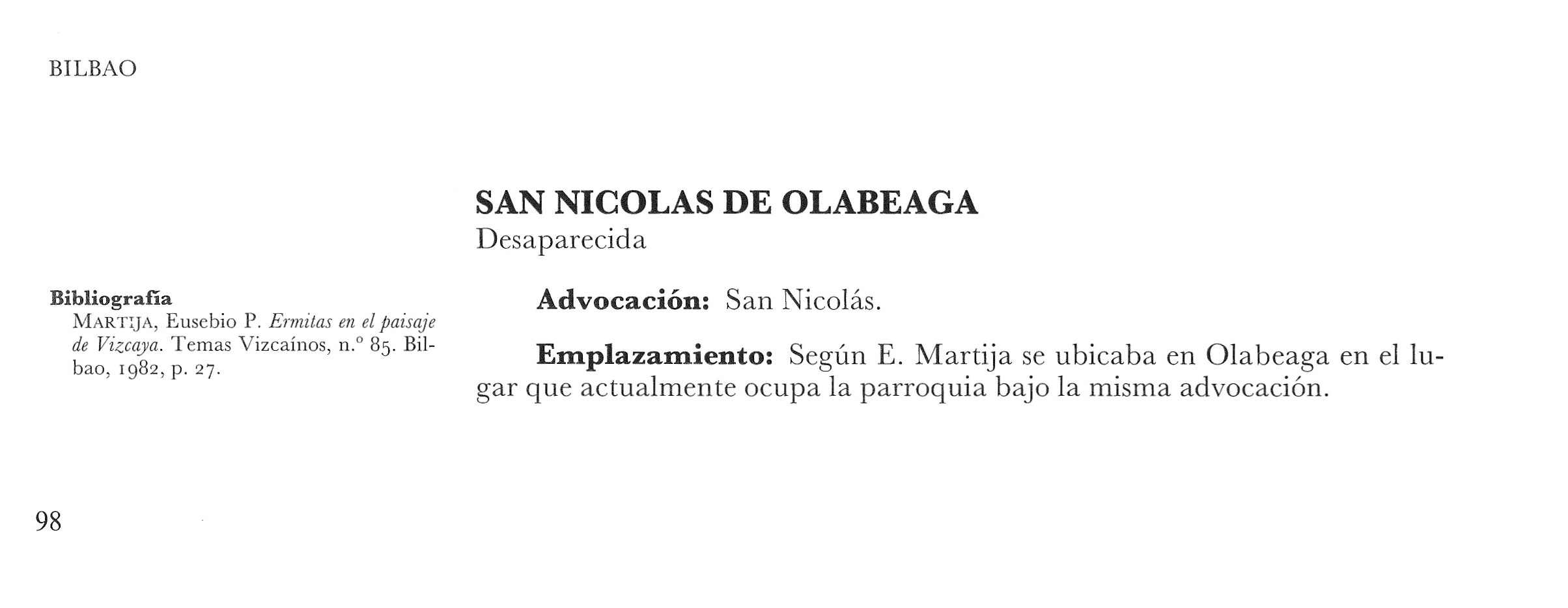 SAN NICOLAS DE OLABEAGA Desaparecida Advocación: San Nicolás. Emplazamiento: Según E. Martija se ubicaba en Olageaga en el lugar que actualmente ocupa la parroquia bajo la misma advocación. Bibliografía : MARTIJA, Eusebio P. "Ermitas en el paisaje de Vizcaya". Temas Vizcaínos nº 83. Bilbao, 1981, p. 27. . |