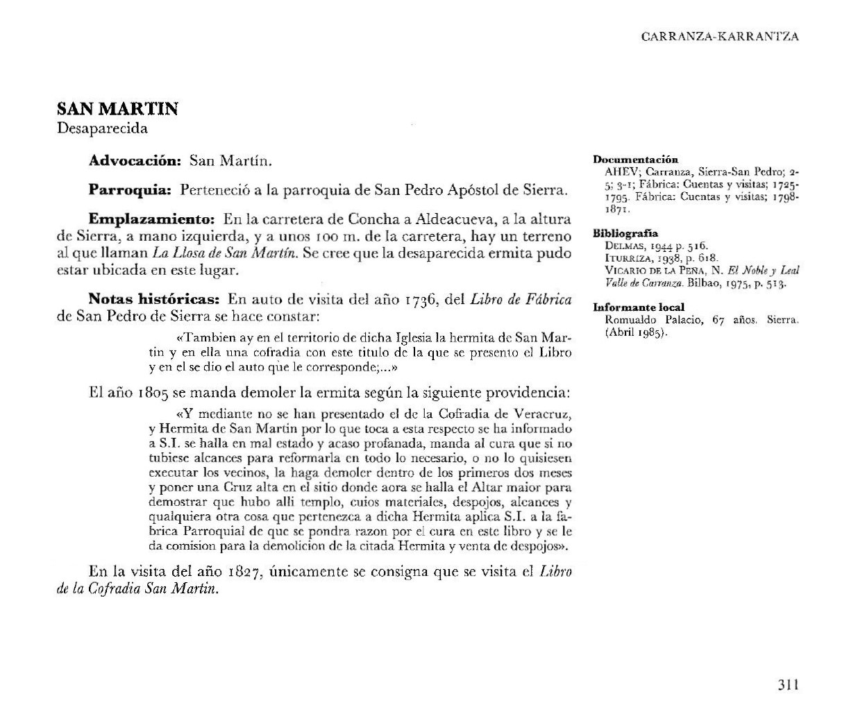 ZONA DE PRESUNCIÓN ARQUEOLÓGICA. Sin estructuras visibles. Clave E: Área que se especifica en el Plano. http://www.euskadi.eus/app/ondarea/patrimonio-arqueologico/ermita-de-san-martin/ermita/karrantza-harana-valle-de-carranza/-sierra/fichaconsulta/60536 https://www.euskadi.eus/y22-bopv/es/bopv2/datos/1997/05/9702862a.pdf |