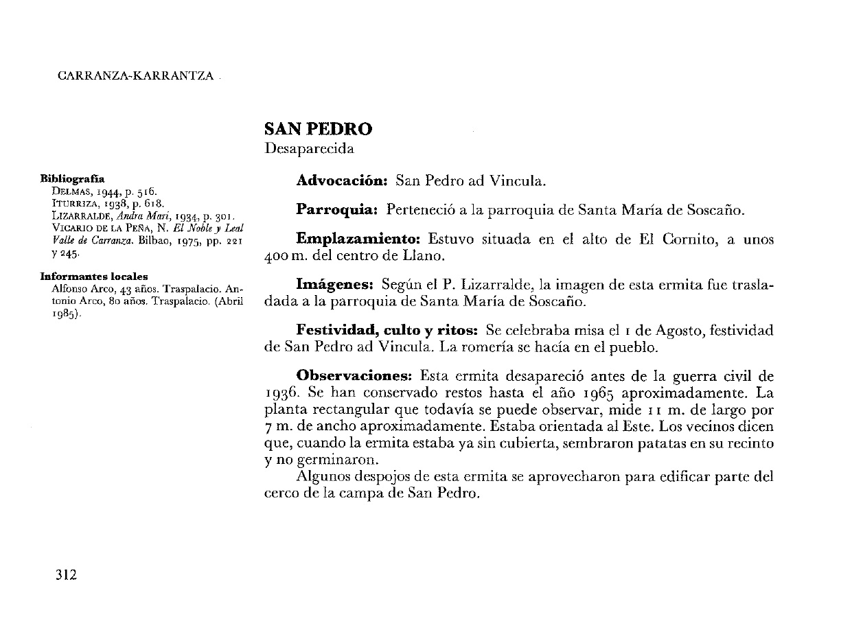 ZONA DE PRESUNCIÓN ARQUEOLÓGICA. Sin estructuras visibles. Clave E: Área que se especifica en el Plano. http://www.euskadi.eus/app/ondarea/patrimonio-arqueologico/ermita-de-san-pedro-advincula/ermita/karrantza-harana-valle-de-carranza/fichaconsulta/60479 https://www.euskadi.eus/y22-bopv/es/bopv2/datos/1997/05/9702862a.pdf |