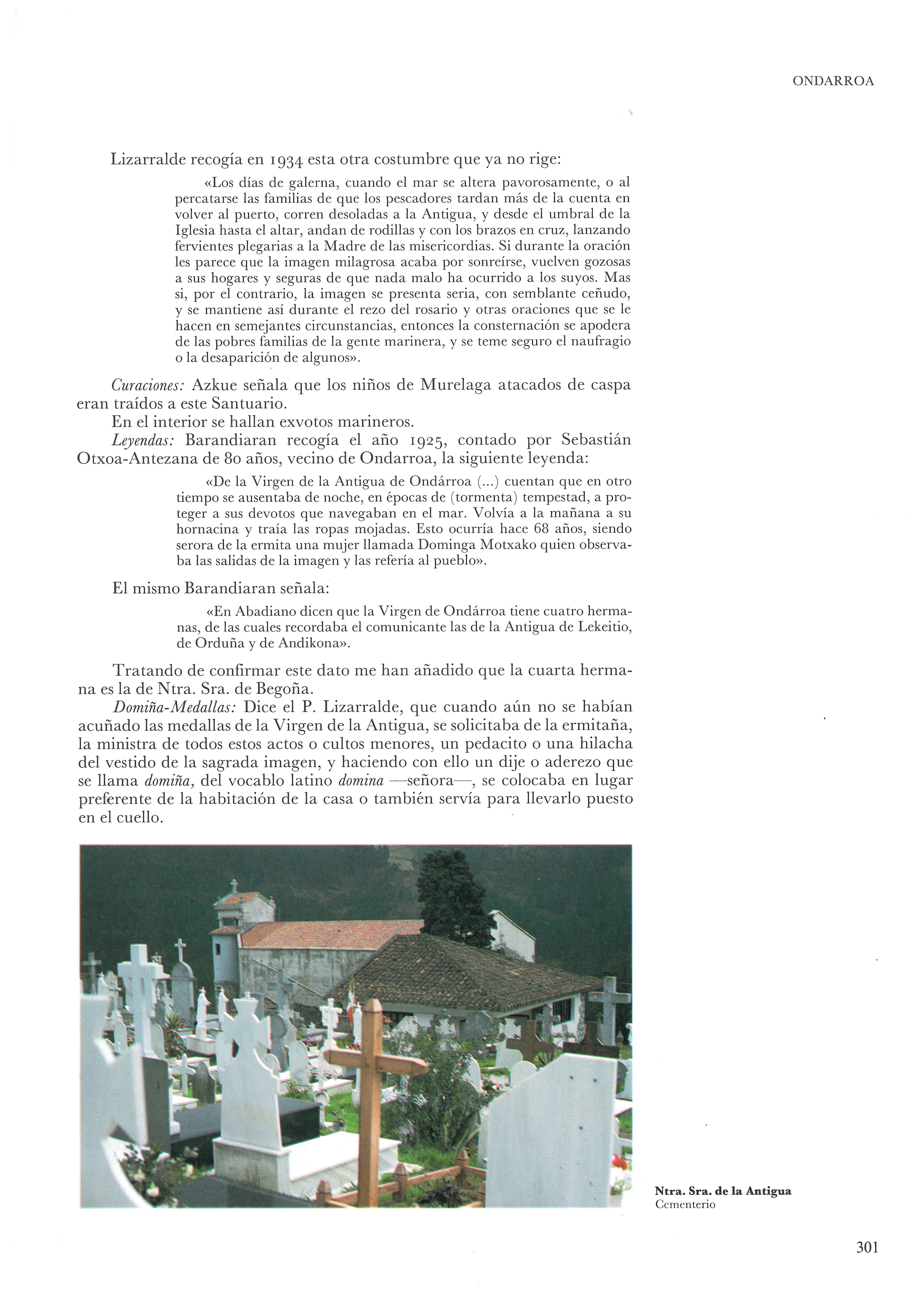 "De la Iglesia de Nuestra Señora de la Antigua, situada en paraje elevado a pocos pasos al W de la villa de Ondarroa, se cuenta la misma leyenda que en tantas variantes hemos repetido en las páginas anteriores. Los vecinos de Ondarroa trataron de construir un templo en el sitio que hoy ocupa la iglesia parroquial; mas los materiales reunidos de dia en aquel lugar, eran transportados de noche por algún poder misterioso a sitio más elevado, donde por fín, entendiendo que así sería la voluntad divina, fue construida la iglesia, hoy llamada de Nuestra Sra. de la Antigua ". (Contada por la anciana de 80 años, llamada Sebastiana de Ochoa Antozana, de Ondarroa) Gorago aitatu doguzan Ama Birjiña'ren gabeko ibillerak, Barandiaran berberak be batzen ditu aitatutako liburuan. Ara berak diñona, Sebastiana berberaren aotik berak entzuna: De la Virgen de la Antigüa de Ondarroa, cuyo santuario se halla en paraje elevado dominando a aquella villa, cuentan que en otro tiempo se ausentaba de noche, en épocas de tempestad, a proteger a sus devotos que navegaban en el mar. Volvía a la mañana a su hornacina y traía las ropas mojadas. Esto ocurría hace 68 años, siendo serora de la ermita una mujer llamada Domingo Matxoko, quien observaba las salidas de la imagen y las refería al pueblo". |