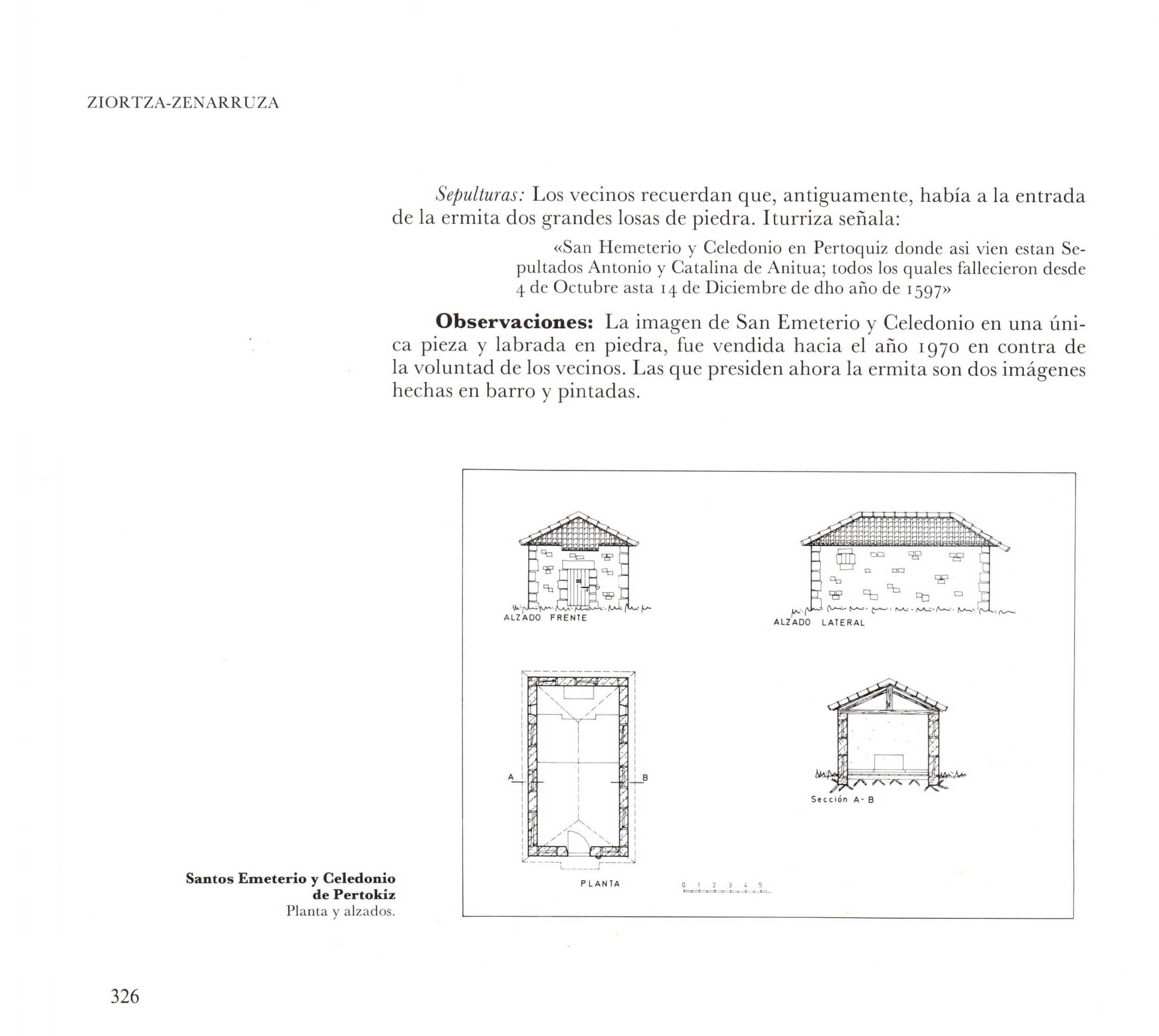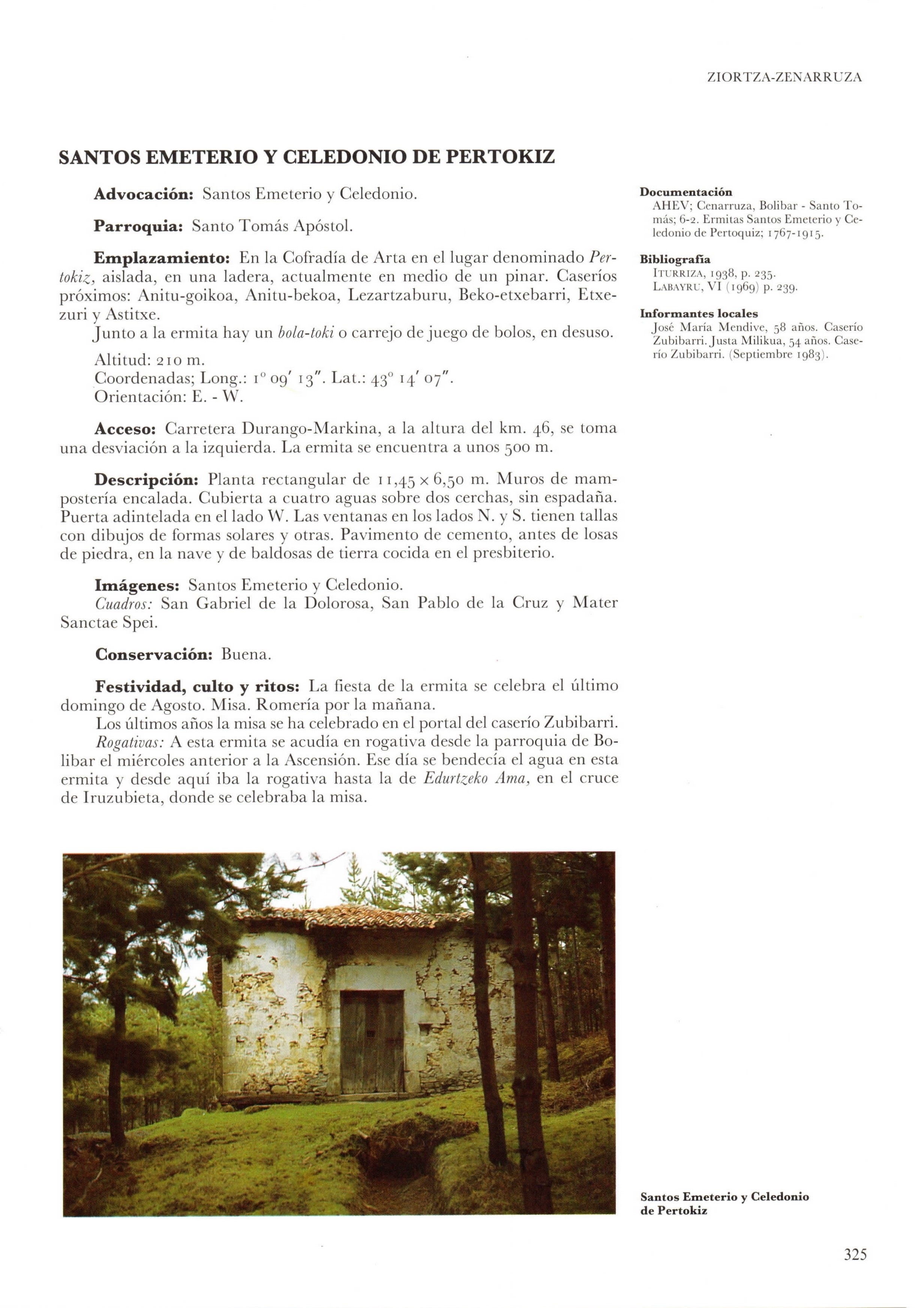 Ermita de los Santos Emeterio y Celedonio (Pertokiz. Barrio Arta) Ermita popular de planta rectangular. Se enterraron en esta ermita algunos vecinos del caserío Anitua como consecuencia de la peste de 1597. Junto a la ermita, bolera descubierta, donde se practica la modalidad denominada "hiru txirlo". Festividad: el día 30 de agosto. Se celebra misa y romería. |