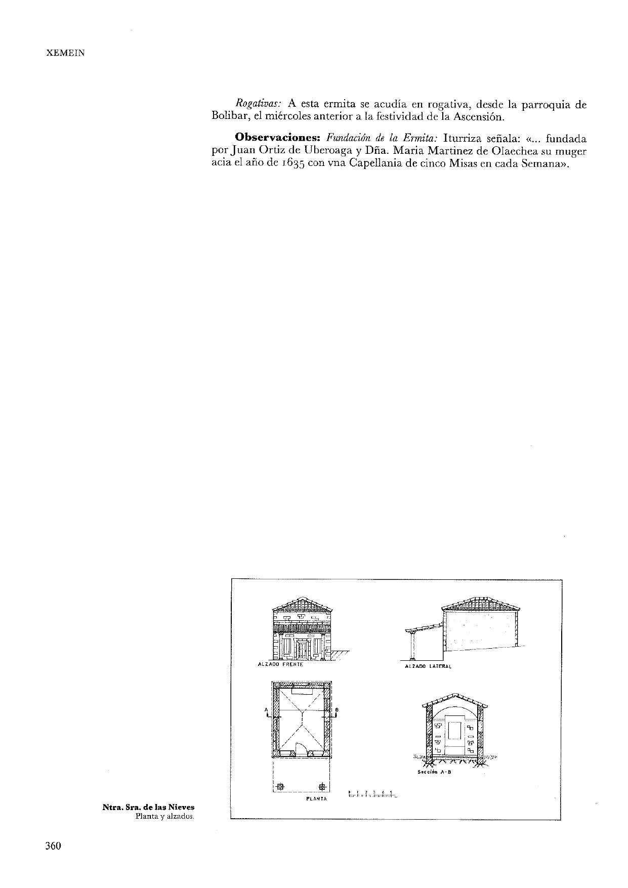 NUESTRA SEÑORA DE LAS NIEVES Advocación: Ntra. Sra. de las Nieves, popularmente "Edurtzeko Ama Birjina". Mugartegui la denomina La Asunción de la Virgen e Iturriza Ntra. Sra. de la Concepción. Parroquia: Eclesiásticamente pertenece a la parroquia de Santo Tomás de Bolibar. Emplazamiento: En el barrio Iruzubieta, junto al río Artibai y la carretera. Caseríos próximos : Errementarikua, Katekua e Ibaiondo. Altitud : 120 m. Orientación : SW. - NE. Acceso: Carretera Durango-Markina, pasado el cruce y puente de Iruzubieta, a mano derecha. Descripción: Planta rectangular de 8,85 x 6,73 m. La fachada principal está construida en sillería y el resto en mampostería vista. Cubierta a cuatro aguas. Sin espadaña. La campana está suspendida de una de las vigas del pórtico. Puerta adintelada en el lado NE. Una ventana adintelada en el lado SE. Pavimento de baldosas de tierra cocida en el interior y de canto rodado en el pórtico, que sitúa a los pies sobre dos columnas toscanas. Imágenes: Nuestra Señora, San Sebastián, Santa Lucía, San José y Bartolomé. Conservación: Buena. El año 1981 ha sido reparada a cuenta de la familia Errementarikua. Festividad, culto y ritos : El 5 de Agosto, festividad de Ntra. Sra. de las Nieves. La fiesta se celebra el domingo siguiente. Misa cantada. Romería popular. El día 9 de Mayo, festividad de San Gregorio, se celebra misa. Rogativas : A esta ermita se acudía en rogativa, desde la parroquia de Bolibar, el miércoles anterior a la festividad de la Ascensión. Observaciones : Fundación de la ermita :. Iturriza señala :. "... fundada Semana por Juan de Ortiz de Uberoaga y Dña. Maria Martinez de Olaechea su muger acia el año de 1635 con vna Capellania de cinco Misas en cada Semana". Informantes locales (Septiembre 1983) Donata Ibaibarriaga, 63 años. Caserío E rrementarikue. Antonia Larruskain, 50 años. Caserío Errementarikue. Bibliografía ITURRIZA, 1938, p. 235. LABAYRU, VI (1969) p. 239 MUGARTEGUI, Juan J. de "La Villa de Marquina". Bilbao, 1927, p. 122. |